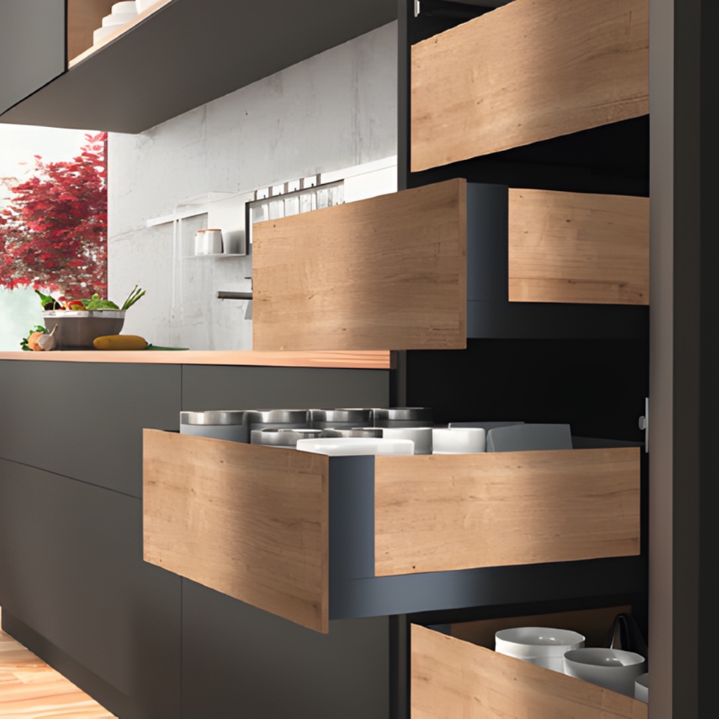 El cajón interior Hettich AvanTech esta dispuesto con frente de madera a juego con el interior del cajón.