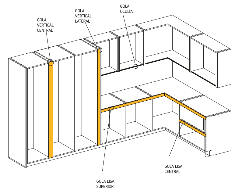 Para determinar el carácter y personalización de la cocina siempre hay que elegir entre gola o tiradores.